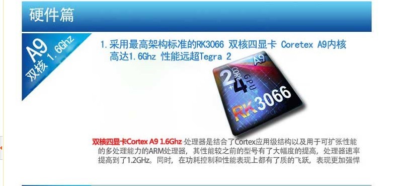 瑞星微A9雙核RK3066(2核CPU,4核GPU),主頻1.5G |