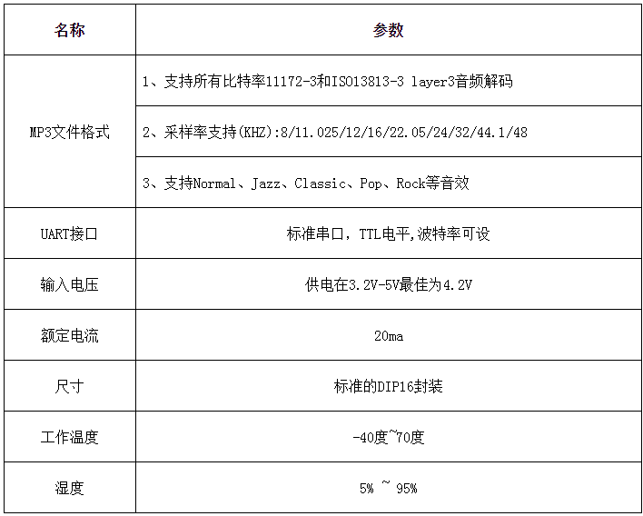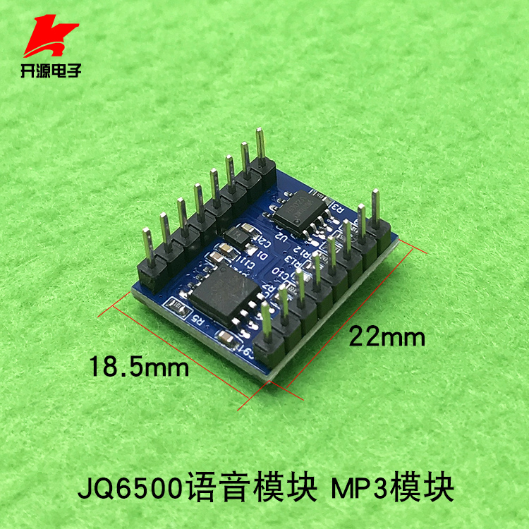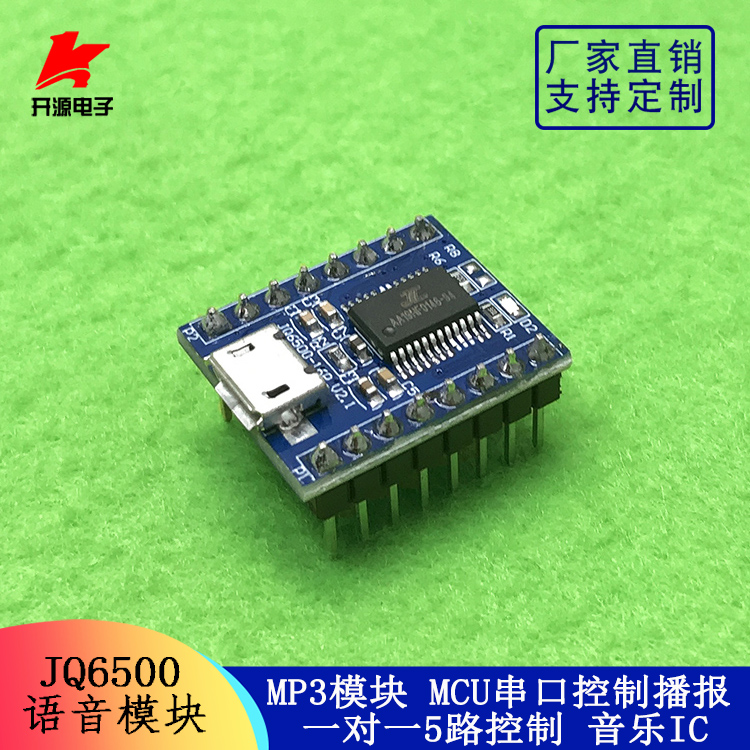 JQ6500是一個提供串口的MP3晶片,完美的集成了MP3、WMV的硬解碼。同時軟體支援TF卡驅動,支援電腦直接更新spi flash的內容,支援FAT16、FAT32檔案系統。通過簡單的串口指令即可完成播放指定的音樂,以及如何播放音樂等功能,無需繁瑣的底層操作,使用方便,穩定可靠是此款產品的最大特點。另外該晶片也是深度定制的產品,專為固定語音播放領域開發的低成本解決方案。