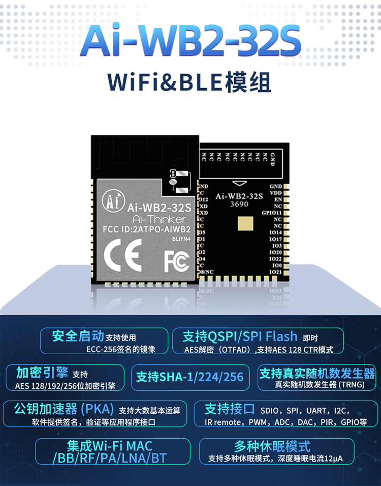 安信可WiFi藍牙BLE二合一模組Ai-WB2-32S板載天線封裝相容ESP32-S
