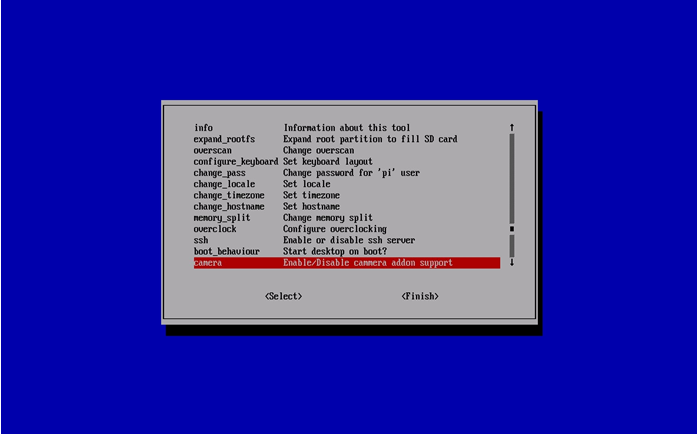 2. raspi-config中選擇camera,啟動RPi固件中的攝像頭驅動,然后重啟